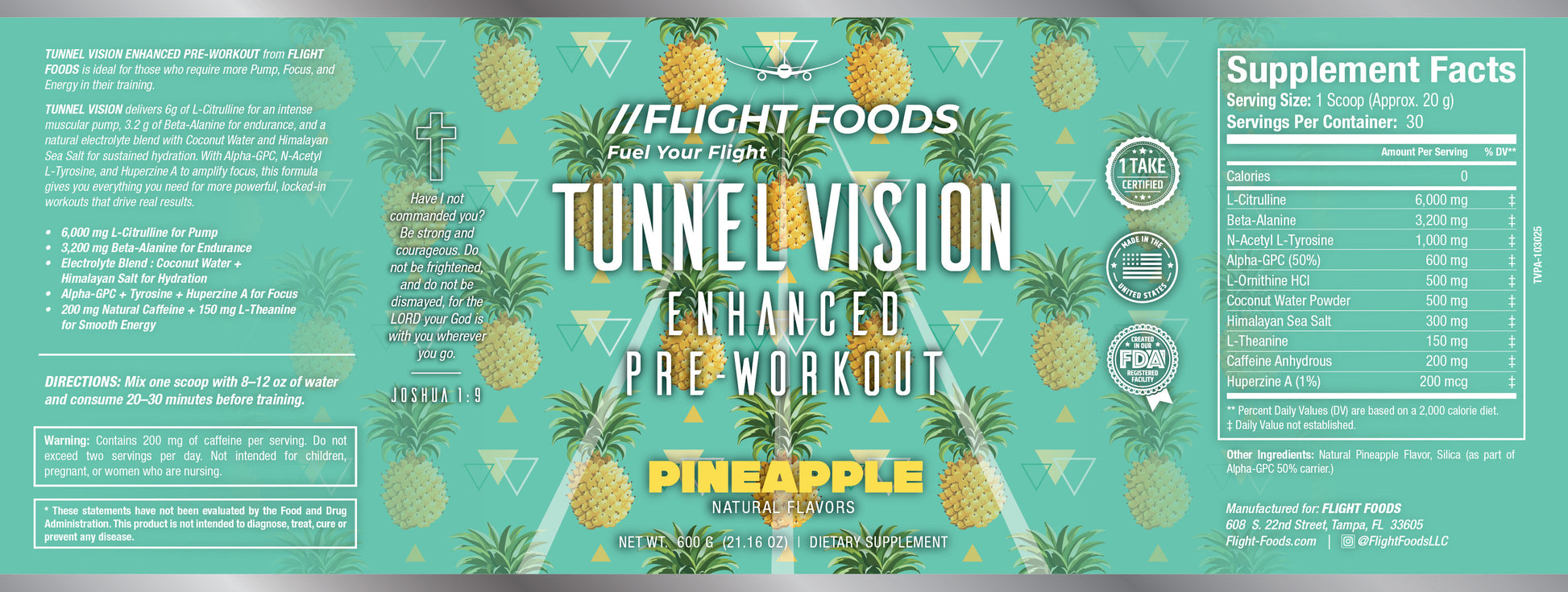 Because at Flight Foods, we believe performance is worship. This is more than just another pre workout — it’s fuel for your mission, body and spirit aligned. Tunnel Vision Pre-Workout is formulated for clean energy, reliable focus, and endurance that supports both your training and your values.